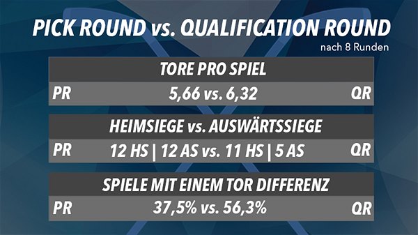 Während in der Pick Round der Erste Bank Eishockey Liga nach acht Runden 24 Spiele absolviert wurden, fanden in der Qualification Round 16 Begegnungen statt. Mit 6,32 Toren pro Spiel fielen in der QR durchschnittlich rund 0,7 Tore mehr als in der PR.